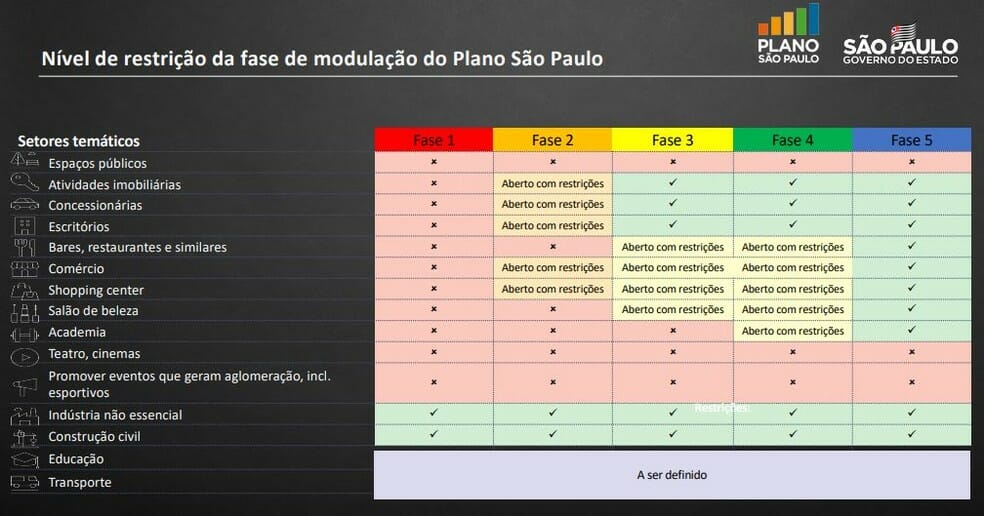 As regiões serão avaliadas constantemente de acordo com os indicadores de saúde, estudando sempre se estão cumprindo os critérios necessários para avançar para uma próxima fase. Todos terão que se adaptar com o novo normal, uso de máscaras obrigatório e restrições nos estabelecimentos.